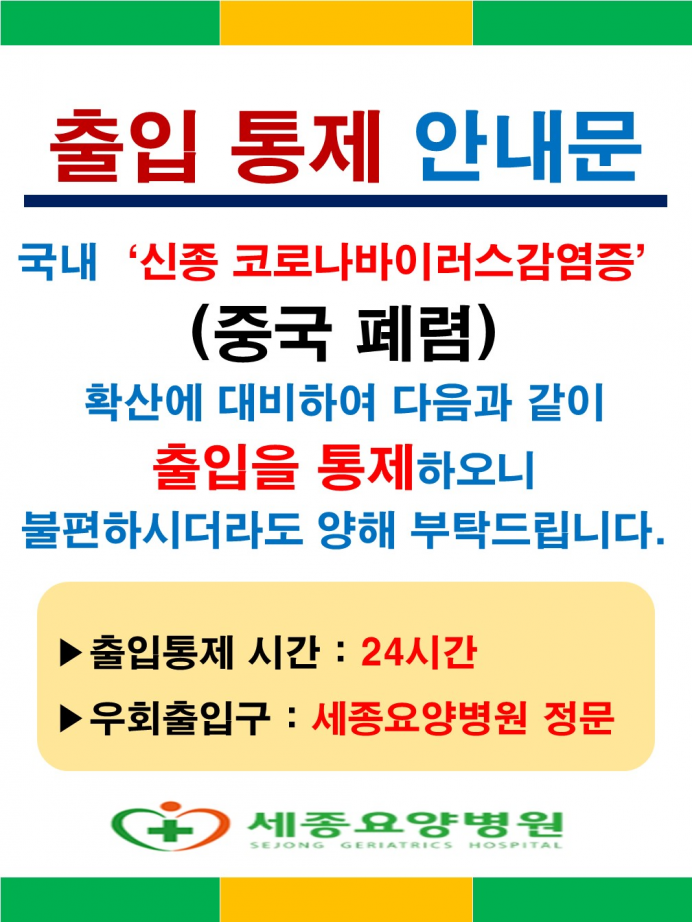 코로나바이러스 감염증으로 인한 세종요양병원 출입통제 안내문