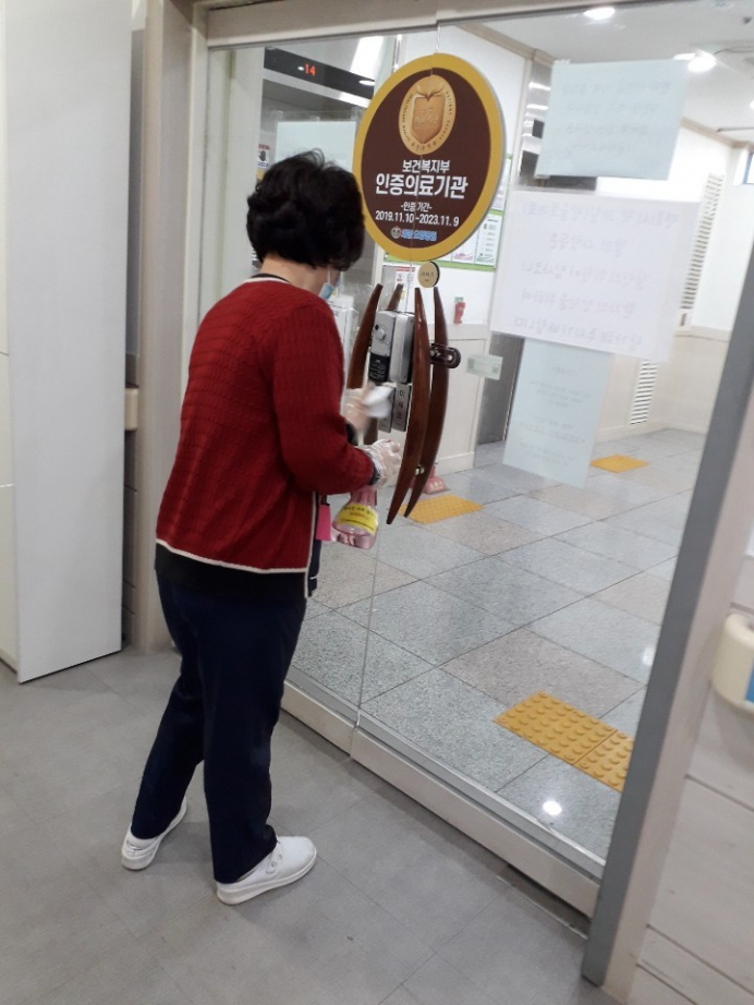 세종요양병원 15병동을 코로나19감염예방 위해 엘리베이터 및 입구 손잡이 소독실시하였습니다.