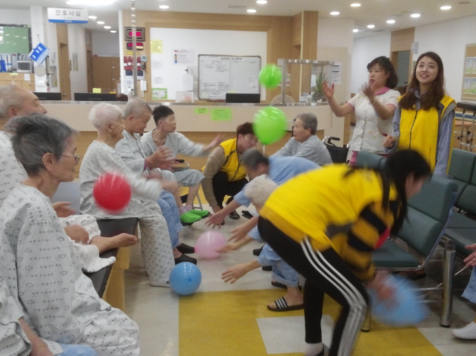 11병동 어르신들께서 풍선배구를 매우 즐겁게 실시하셨습니다.