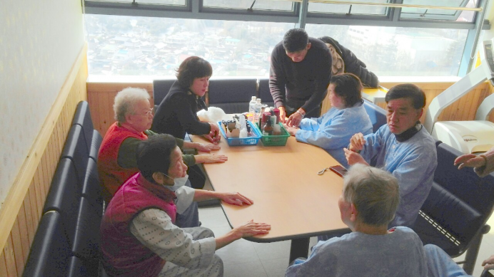어르신들께서 각자의 취향대로 매니큐어 색깔을 고르신 후