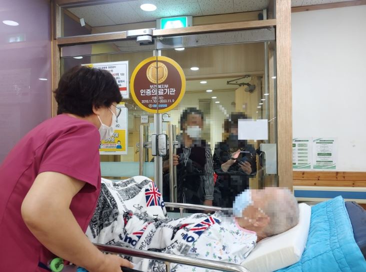 환자와 보호자가 얼굴을 만지면서