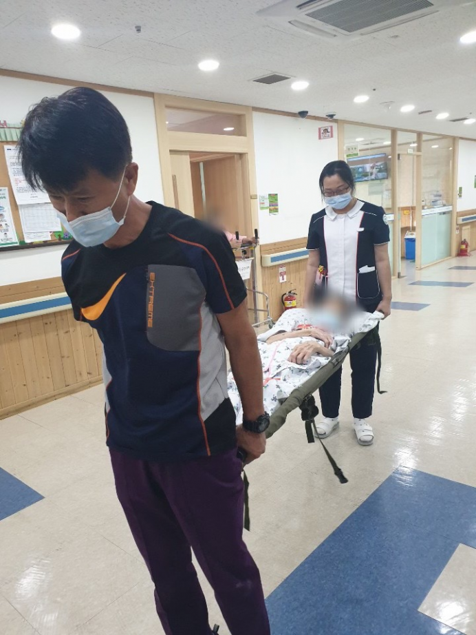 어르신 환자분들 중에는 거동이 불편하신 분도 계시고 대피하시다가 언제 다치실지 모르는 분들이 많기 때문에 비상상황에 대비하여 대피 훈련도 진행하였습니다.