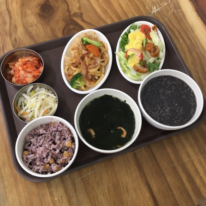 오늘의 점심은 건새우 미역국, 케이준셀러드, 해물우동볶음, 감자채볶음, 배추김치입니다