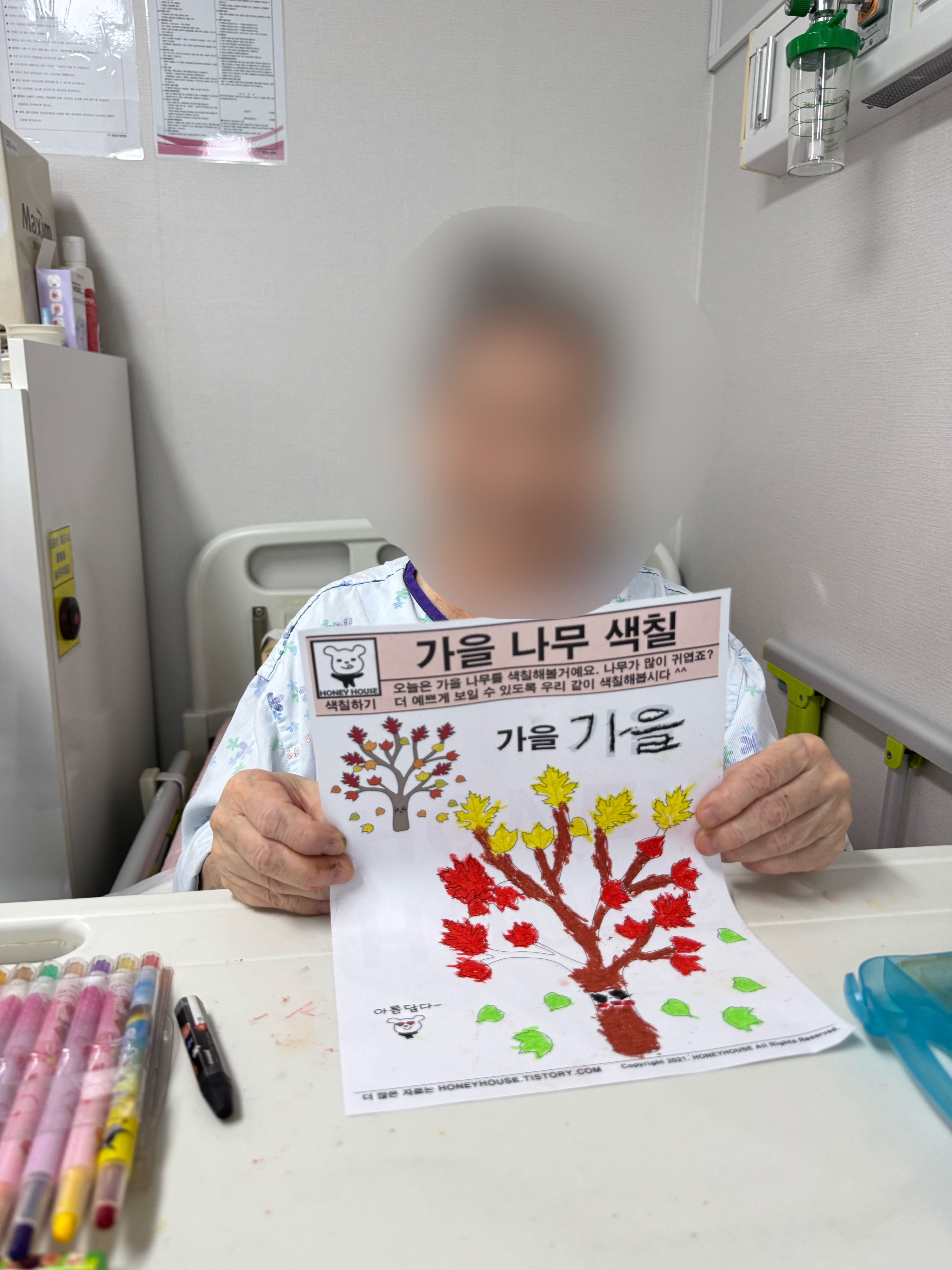 이번에는 나무 도안을 준비하여 각자 원하는 색으로 나뭇잎을 색칠하는 시간을 가졌는데요.