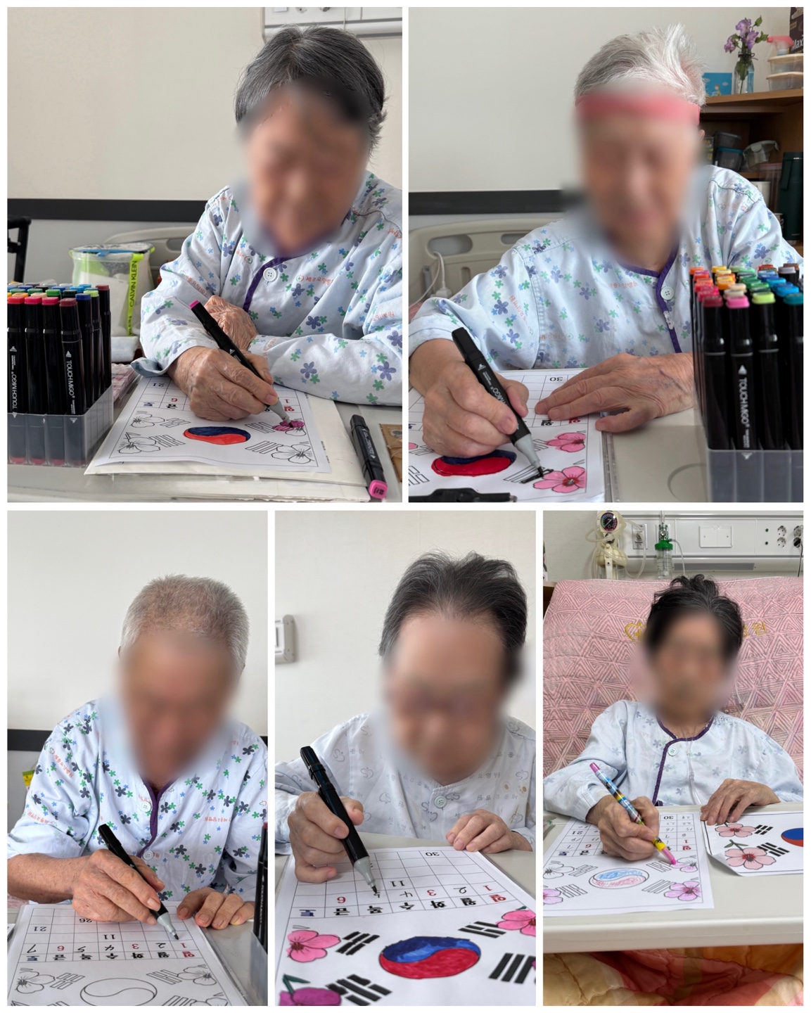 어르신들과 함께 태극기와 무궁화 도안이 있는