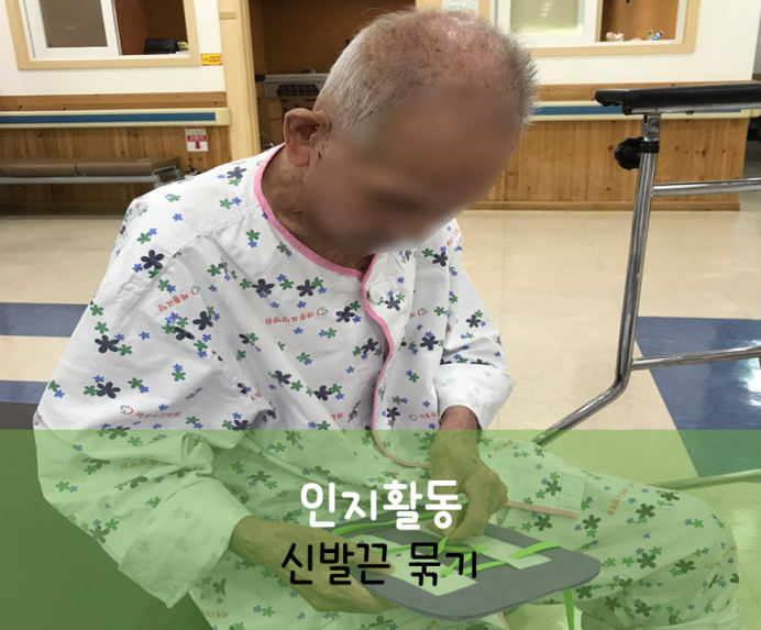 어르신들이 한 칸씩 구멍에 맞게 신발끈을