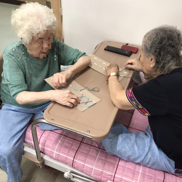 세종요양병원에 입원중이신 어르신들과 함께 소근육발달황동인 빨대에 실 넣기 프로그램를 하였습니다.