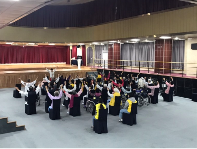 9층예향홀에서 어르신들이 동구청 배달강좌 흥바람! 신바람! 얼씨구!에 즐겁게 참여하고 계십니다