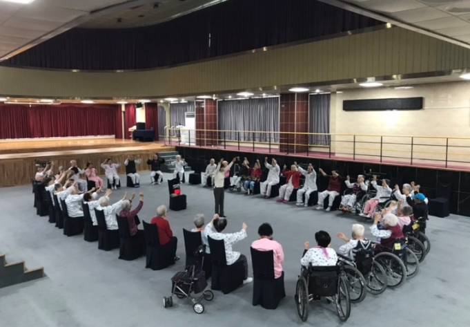 어르신들이 9층 예향홀에서 즐겁게 신바람실버건강체조를 즐기고 계십니다