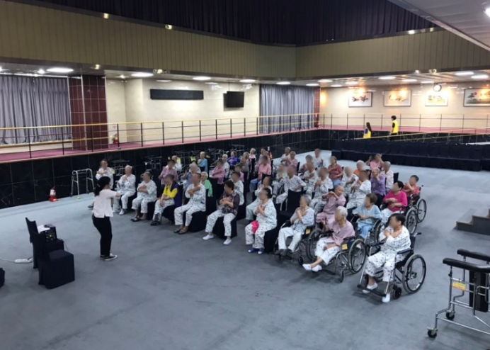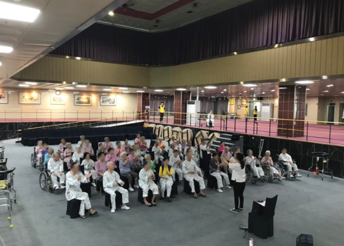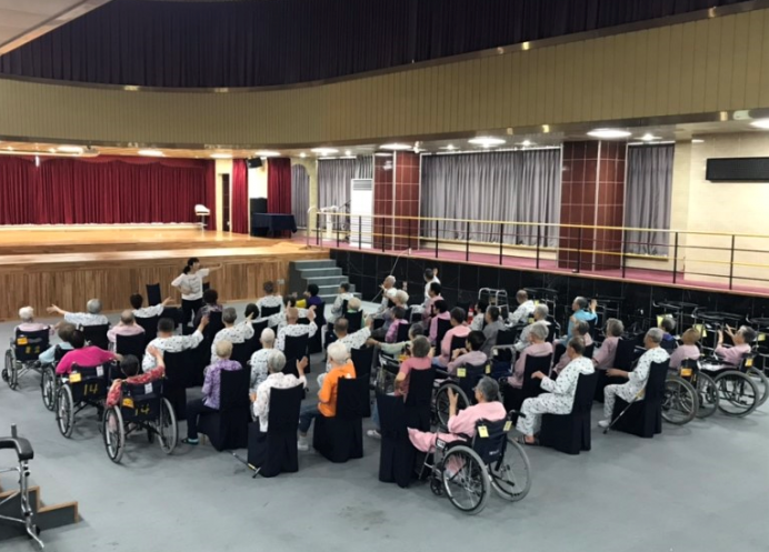 9층예향홀에서 어르신들이 동구청 배달강좌 흥바람! 신바람! 얼씨구!에 즐겁게 참여하고 계십니다.