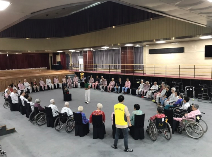 어르신들이 9층 예향홀에서 즐겁게 신바람실버건강체조를 즐기고 계십니다