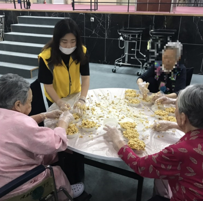 어르신들이 9층 예향홀에서 근로학생들과 봉사학생들과 함께 요리프로그램으로 견과류 삼색 쌀강정 만들기를 하셨습니다!