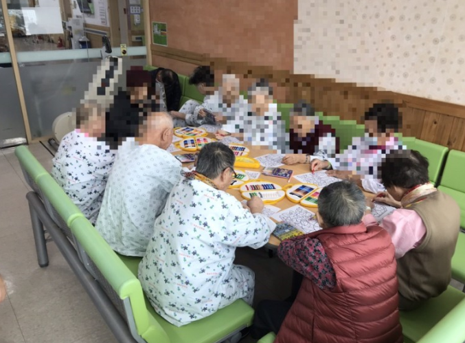 어르신들이 14병동에서 근로학생들과 함께 인지활동과 소근육 발달에 효과가 있는 미술활동(번호에 따라 색칠하기)을 하시는중입니다!