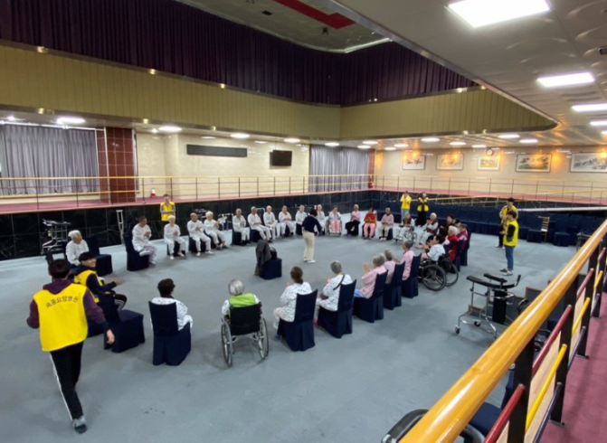 어르신들이 9층 예향홀에서 즐겁게 신바람실버건강체조를 즐기고 계십니다