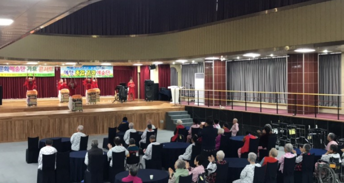9층예향홀에서 어르신들이 신솔문화 예술단, 예향 종합 문화 예술단의 경로 효 콘서트를 관람하셨습니다.