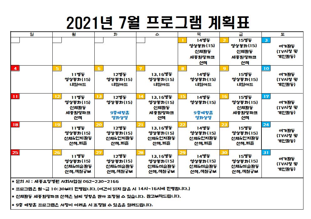 2021년도 7월 프로그램 계획표입니다.
