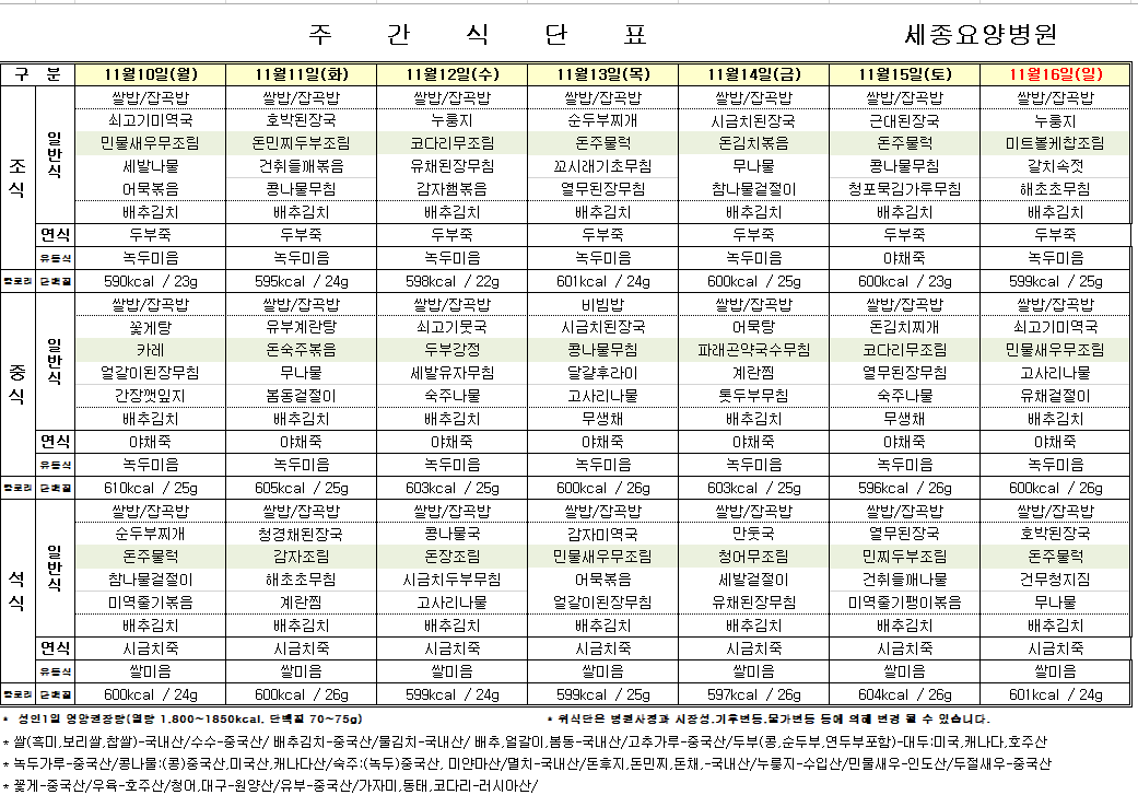 📅25년 11월 둘째 주 식단표(11/10~11/16)