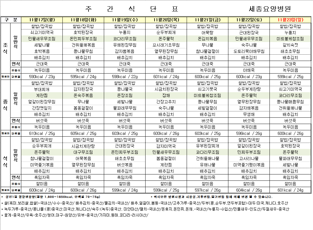 📅11월 셋째 주 식단표(11/18~11/23)