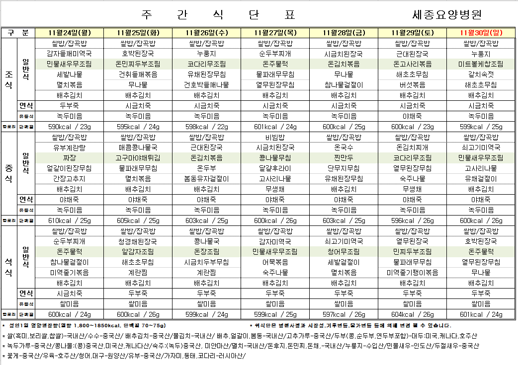 📅11월 넷째 주 식단표(11/24~11/30)