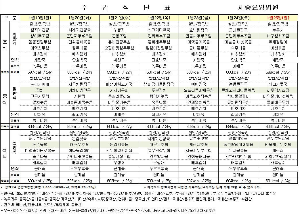 📅1월 넷째 주 식단표(26/01/19~26/01/25)