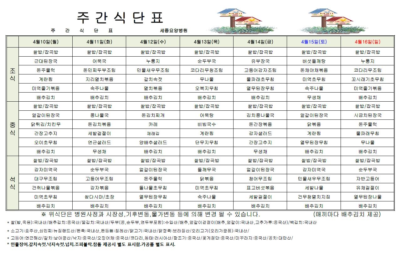 세종요양병원 23년 4월 둘째 주 식단표
