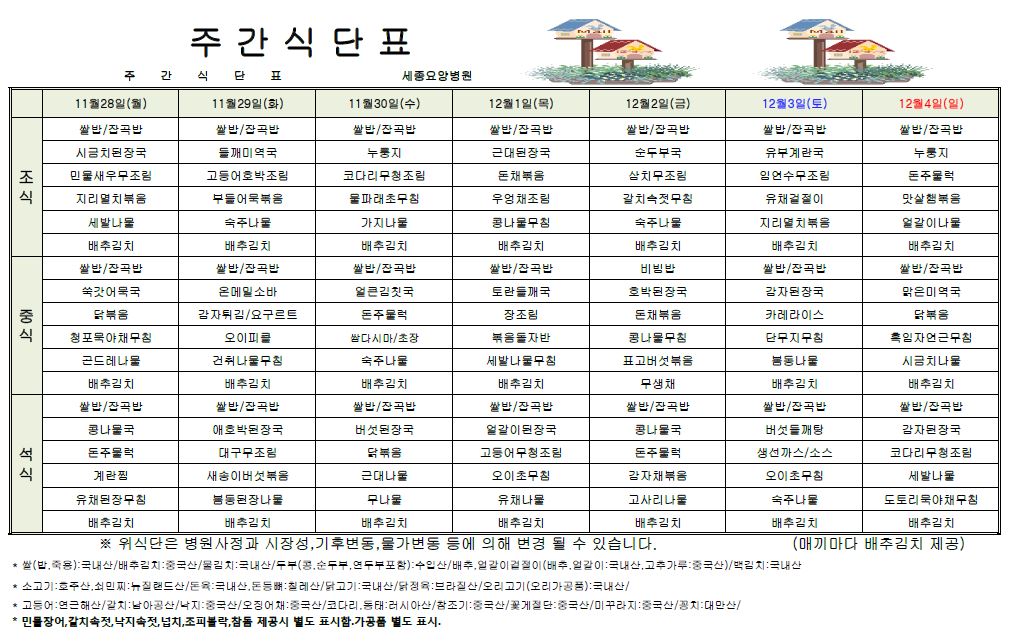 11월 넷째주 식단표입니다.