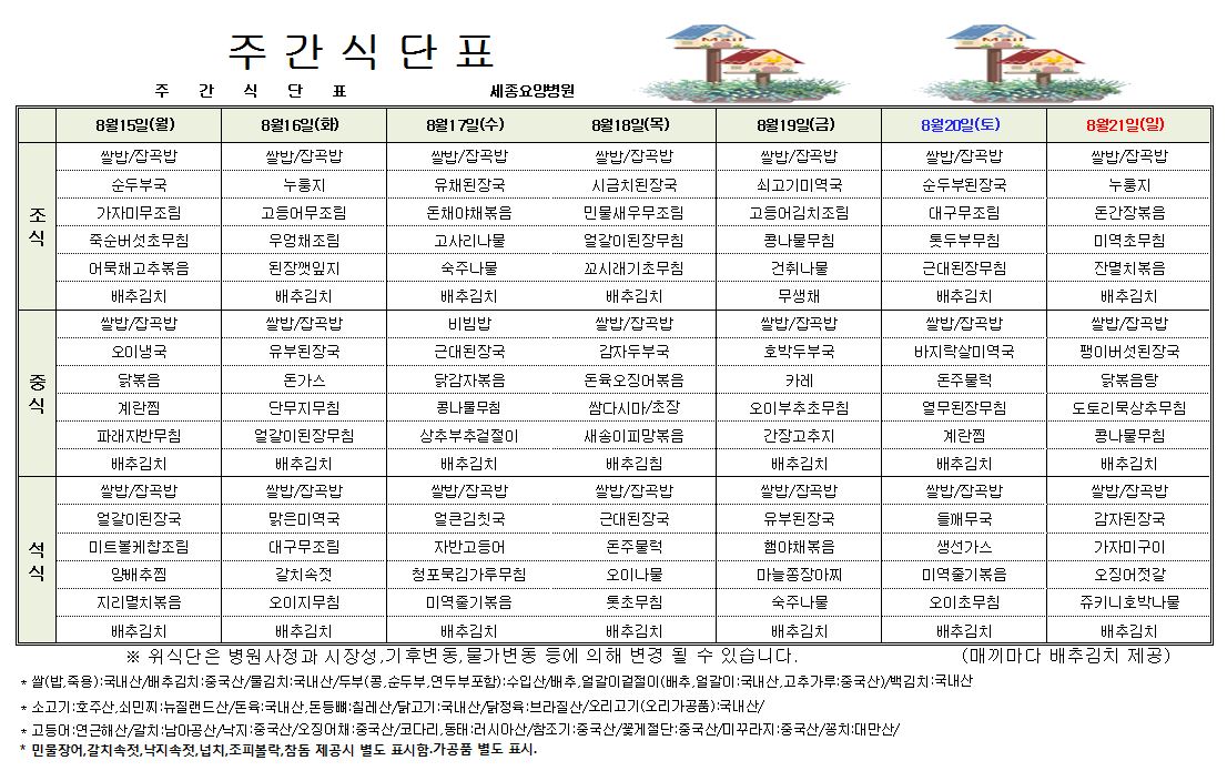 세종요양병원 22년 8월 셋째주 식단표
