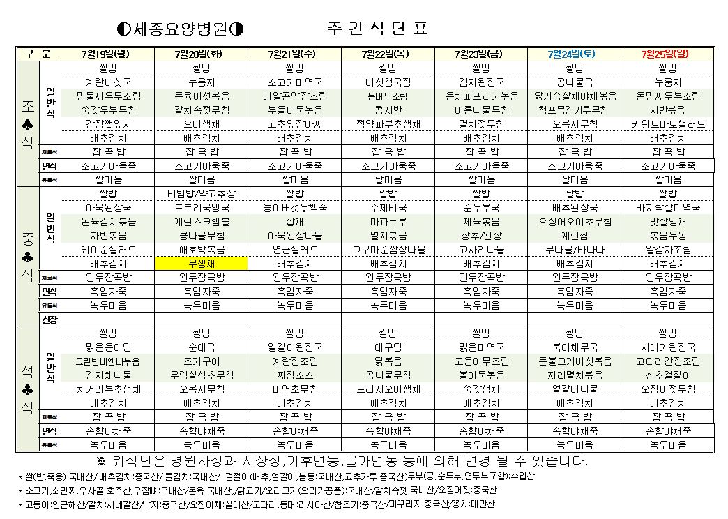 2021년 7월 3째주 식단표 입니다.