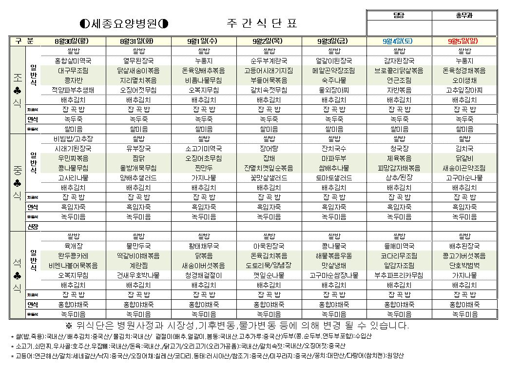 2021년 9월 1째주 식단표 입니다.