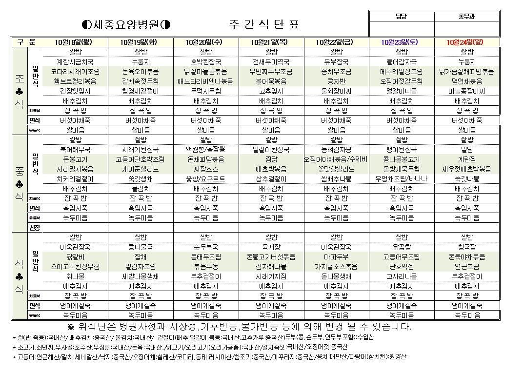 2021년 10월 3째주 식단표 입니다.