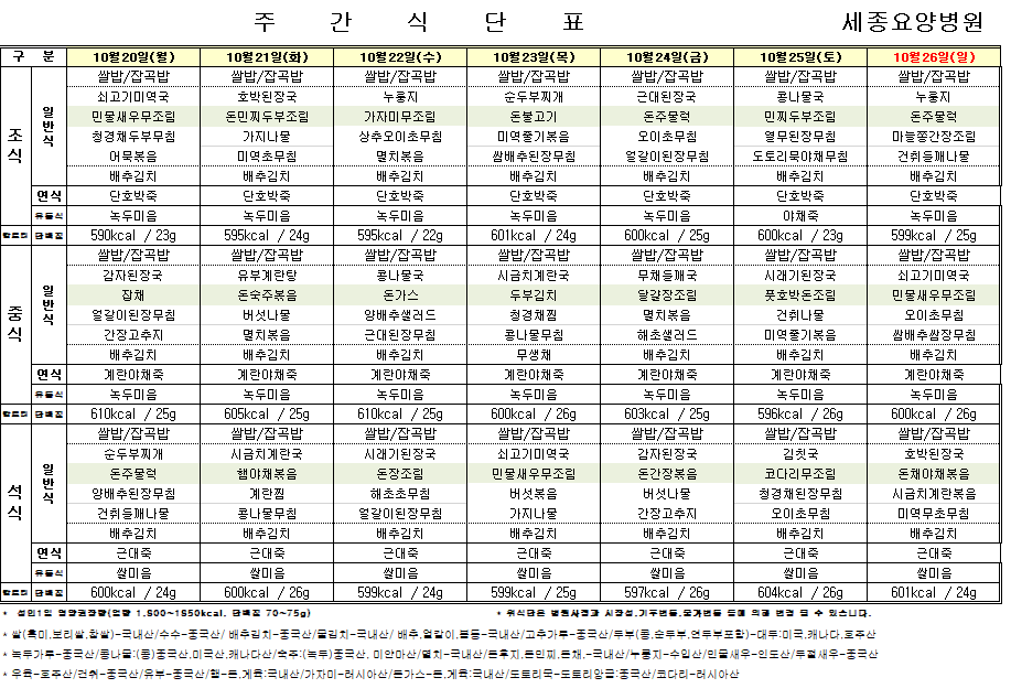 그럼 10월 넷째 주 식단표를 위 사진에서 확인해볼까요?