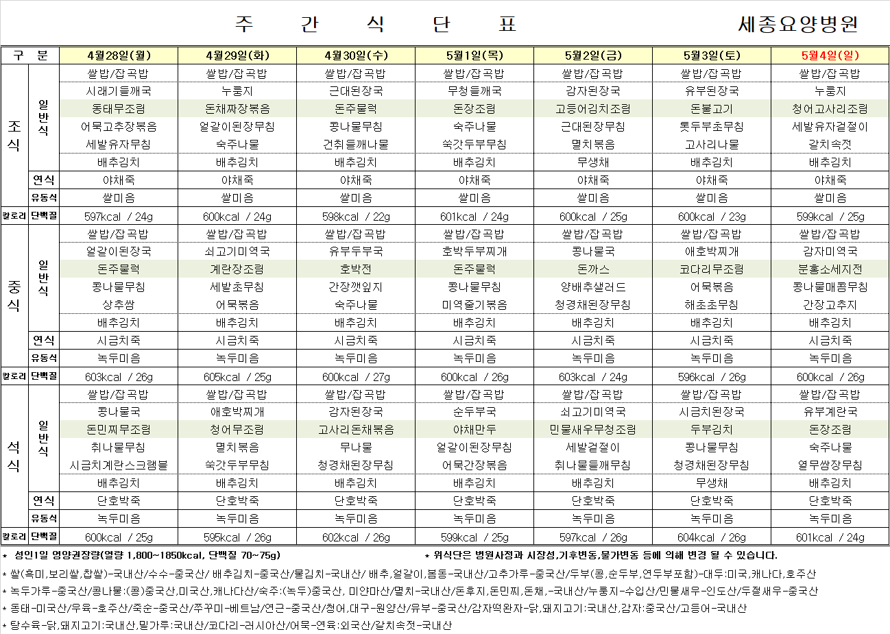 2025년 4월 28일 ~ 5월 4일 식단표입니다.