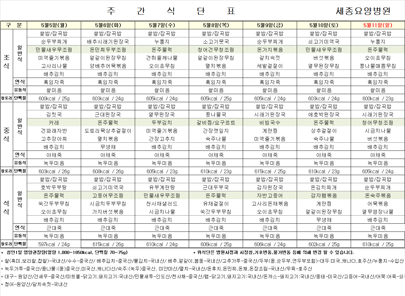 세종요양병원 25년 5월 첫째 주 식단표