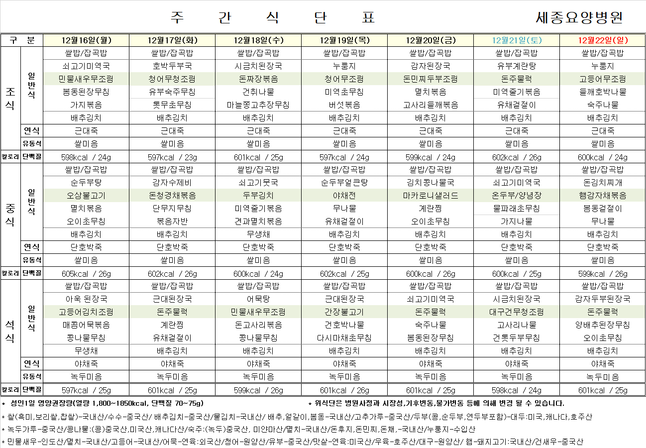 12월 16일 ~ 12월 22일 식단표입니다.