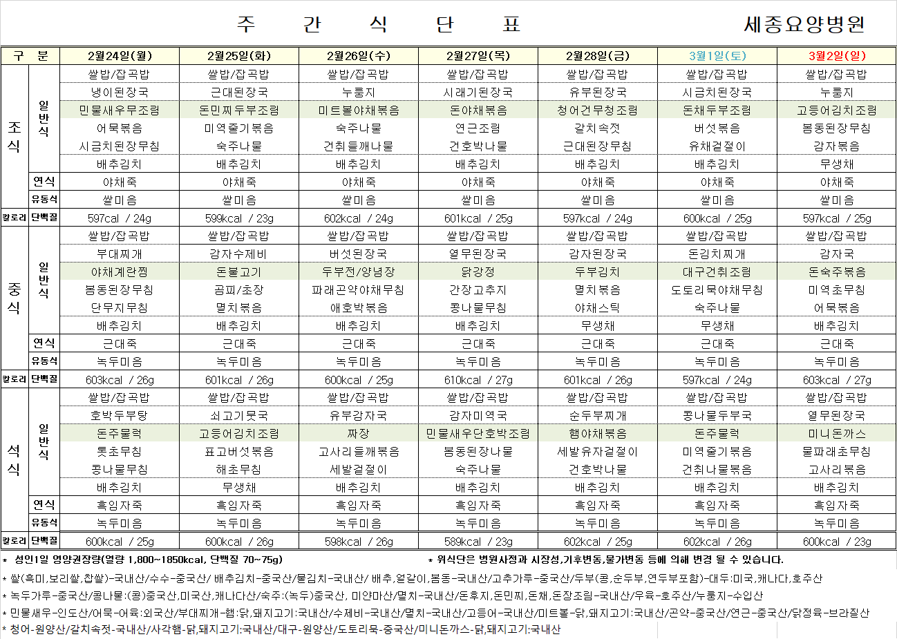 2월 24일 ~ 3월 2일 식단표입니다.