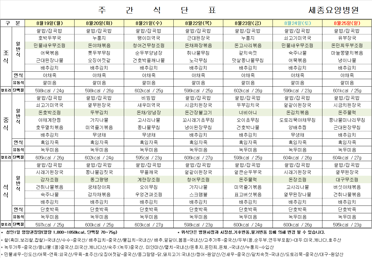 8월 19일 ~ 8월 25일 식단표입니다.
