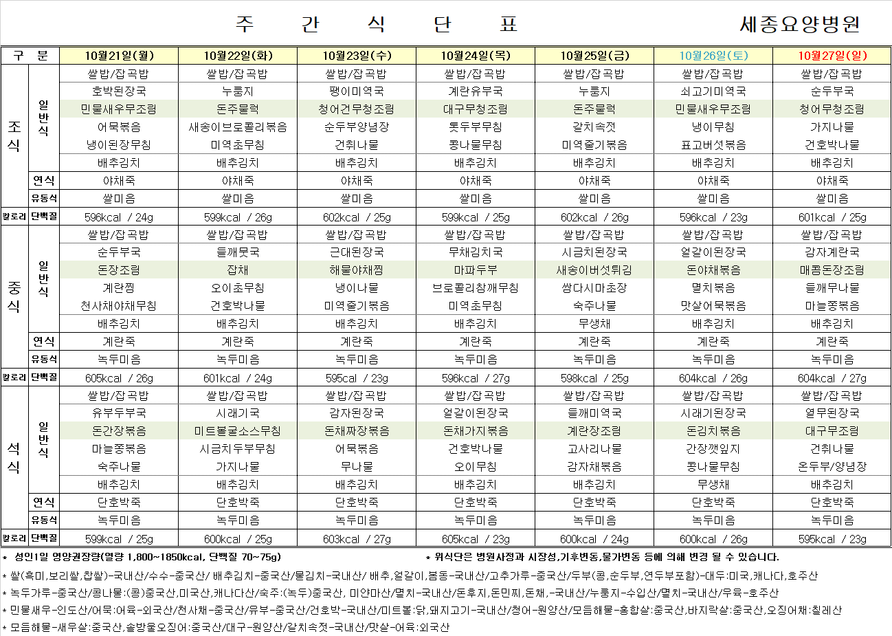 10월 21일 ~ 10월 27일 식단표입니다.
