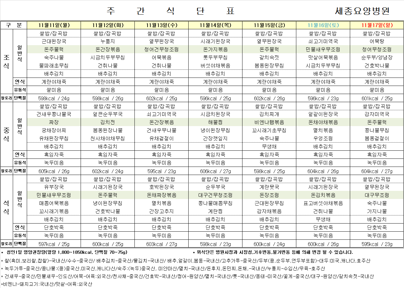 11월 11일 ~ 11월 17일 식단표입니다.