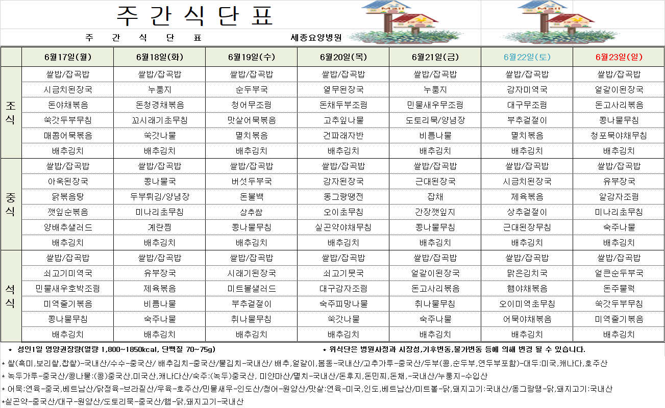 6월17일 ~ 6월23일 식단표입니다.