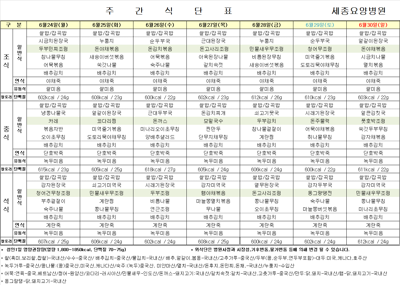 6월24일 ~ 6월30일 식단표입니다.