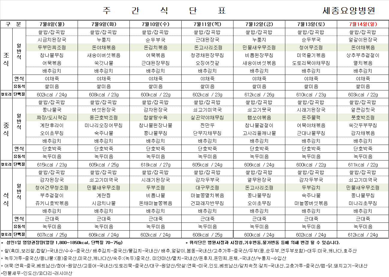 7월 8일 ~ 7월 14일 식단표입니다.