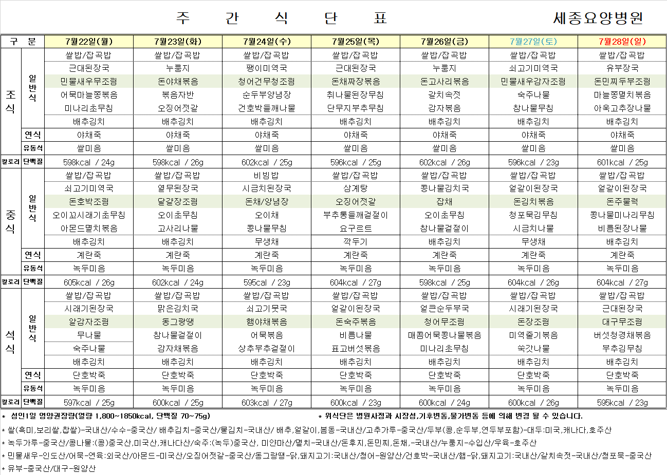 세종요양병원 24년 7월 넷째 주 식단표