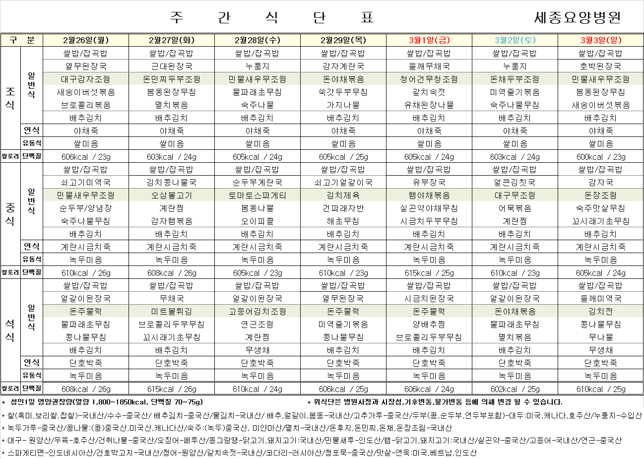 세종요양병원 24년 2월 다섯째 주 식단표