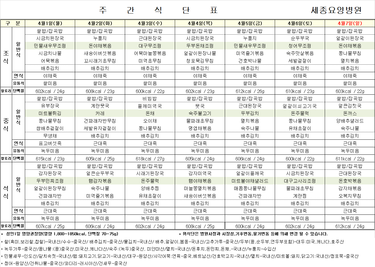 2024년 4월 첫째 주 식단표입니다.