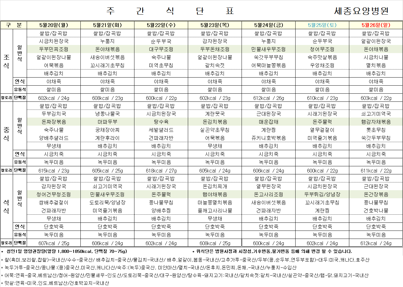 5월 넷째 주 식단표입니다.