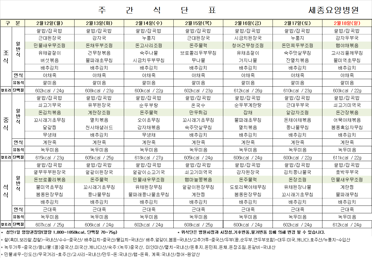 세종요양병원 24년 2월 셋째 주 식단표